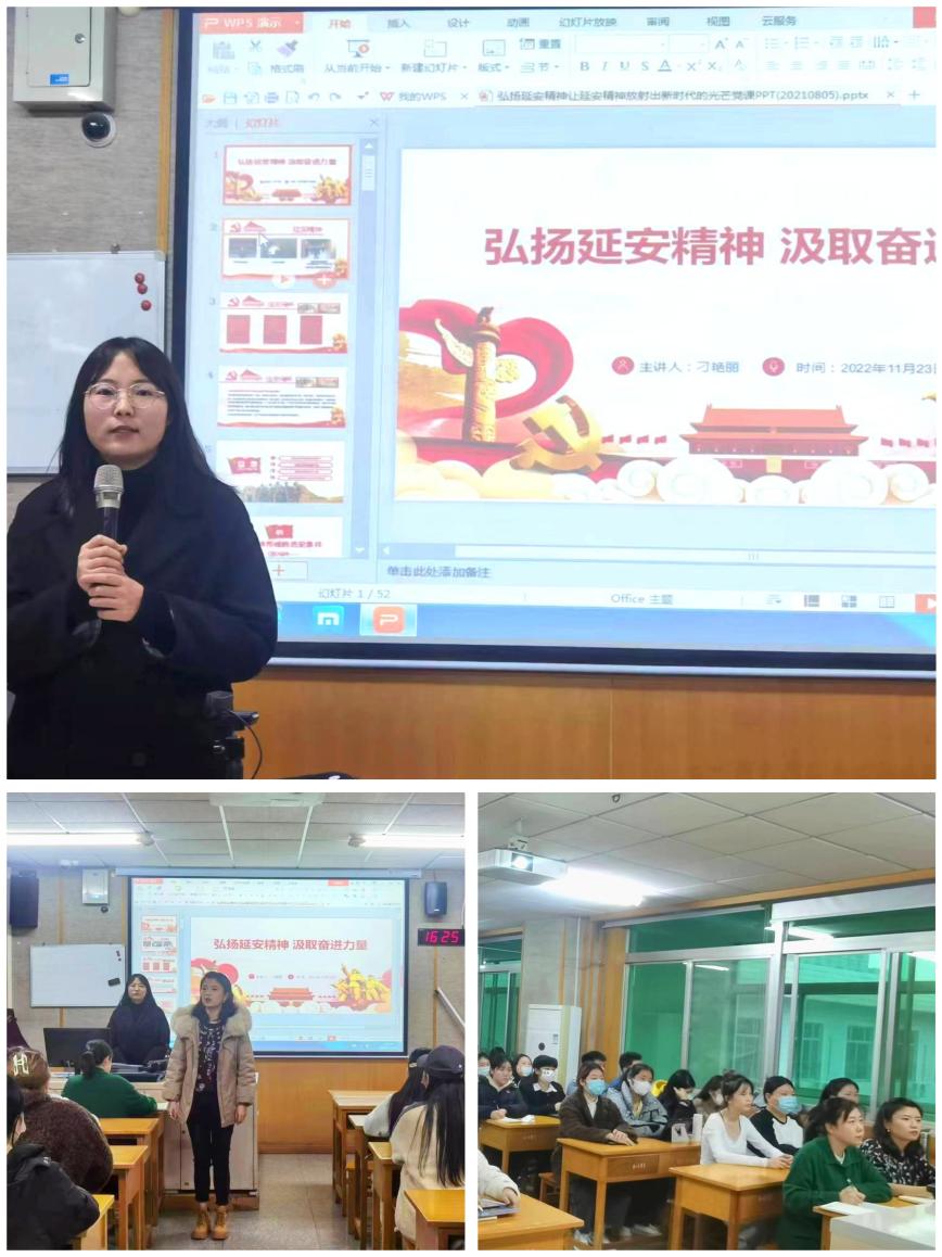 为进一步深入学习宣传贯彻党的二十大精神,提高艺术思政工作质量和水平。按照校党委关于思想政治理论课教师与各院系“结对子”的要求,11月23日,人文学院邀请马克思主义学院教师刁艳丽以“弘扬延安精神 汲取奋进力量”为主题,为人文学院全体学生党员讲授专题党课。