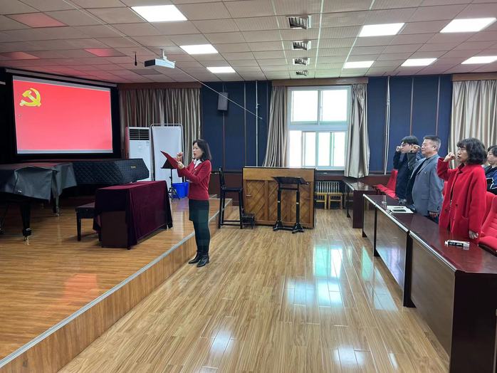 在主题党日活动中,组织委员宣读了党委关于青年教师曹鹏同志转为正式党员的批复,要求全体党员铭记入党初心,持续发挥党员先锋模范作用。由组织委员领誓,全体党员重温了入党誓词。