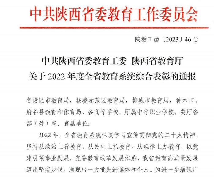 近日,在《中共陕西省委教育工委 陕西省教育厅关于2022年度全省教育系统综合表彰的通报》(陕教工函〔2023〕46号)中,我校国资处张兴华同志获2022年度资产管理先进个人。