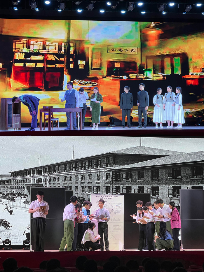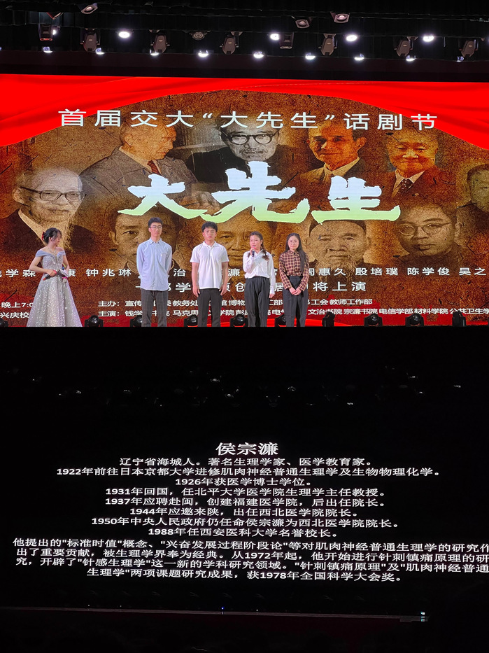 西安交通大学以钱学森、侯宗濂、彭康、陈学俊、周惠久、黄席椿、唐文治、吴之凤、殷培璞、钟兆琳10位交大“大先生”事迹为原型,把他们的鲜活形象和感人事迹,以师生原创话剧的形式搬上舞台。其中,4月16日晚“话剧节”第二场演出讲述了侯宗濂学成归国决心支援北平、黄席椿响应西迁建设交大无线电、周惠久用研究成果推进社会生产的感人事迹。