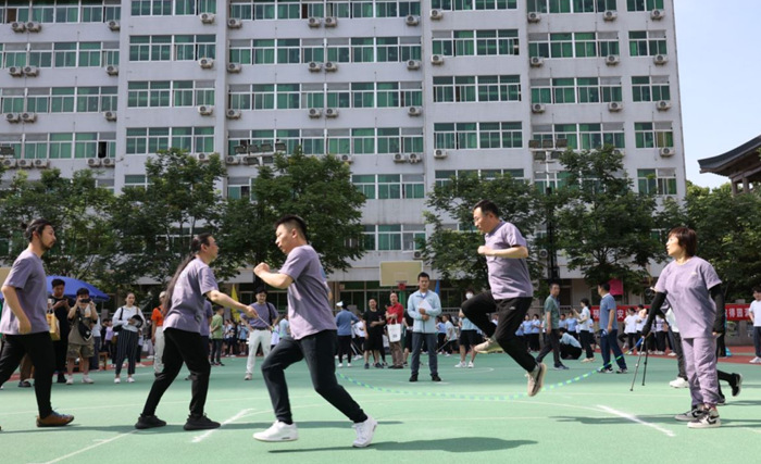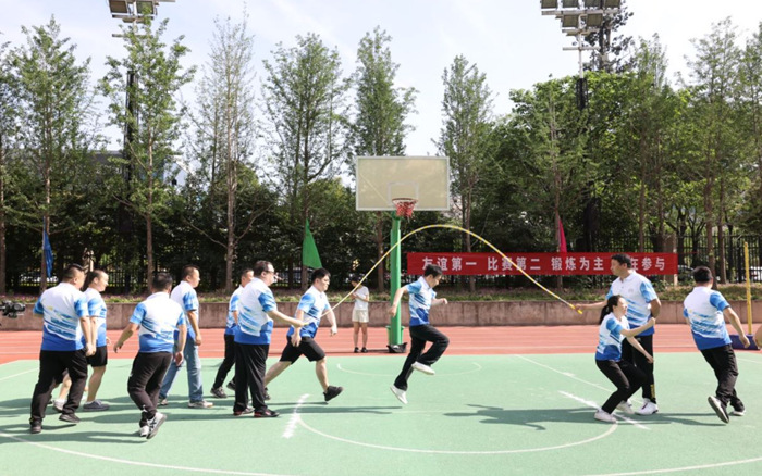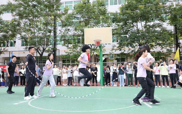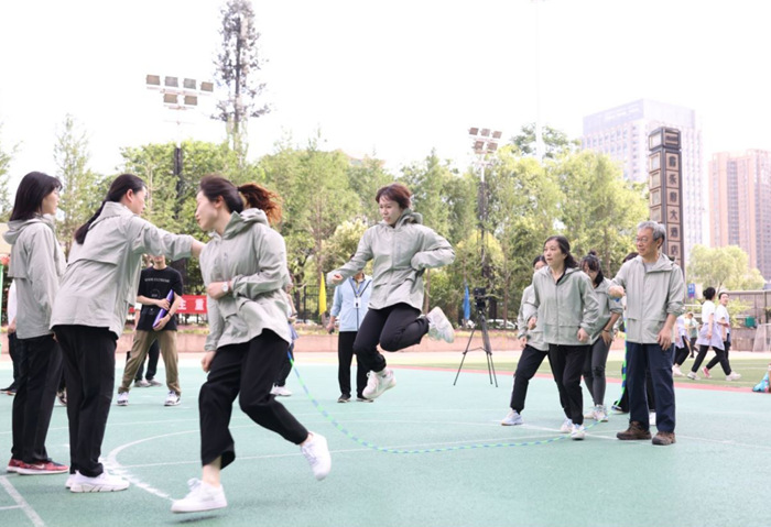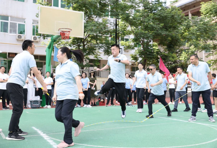 在“集体跳大绳”比赛项目,教职工们全情投入,表现踊跃。裁判长宣告比赛开始,选手们紧盯飞舞的大绳,排列有序紧随跳跃,失败了不气馁立刻投入比赛,现场欢呼声、掌声频频响起。