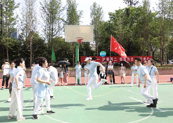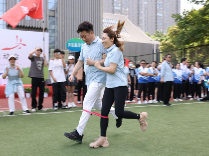 在进行“5×30米往返绑腿接力”比赛项目,大家互相鼓励默契配合,摔倒了立刻爬起来继续前行,这种不畏强手、奋勇争先、重在参与的氛围感染着运动场上的每一个人。