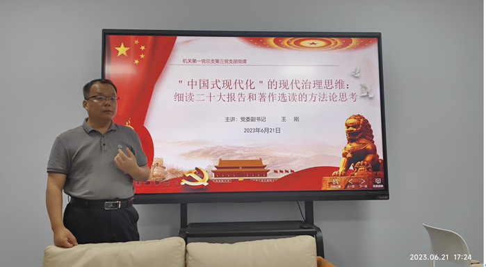 为进一步抓好基层党支部学习贯彻习近平新时代中国特色社会主义思想主题教育,持续深入学习领会党的二十大精神,6月21日下午,校党委副书记王刚参加所在党支部活动,并以《中国式现代化的现代治理思维:细读二十大报告和著作选读的方法论思考》为题,为学工部、团委全体党员讲授专题党课。