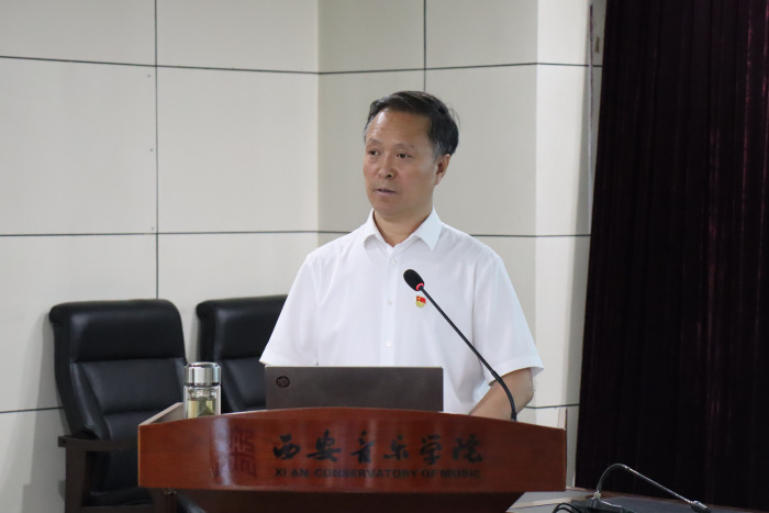 张立杰从主题教育的重大意义入手,阐释了推动高质量发展的时代内涵,分享了推进学校高质量发展的思考。他指出,党的二十大精神和习近平总书记在听取陕西省委和省政府工作汇报时的重要讲话,为我们办好人民满意的高质量艺术教育、服务文化自信自强提供了根本遵循和行动指南。