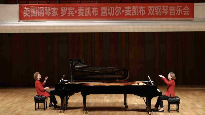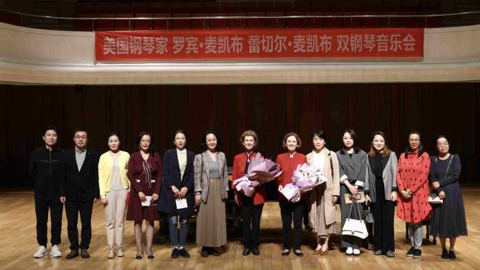 罗宾·麦凯布教授与蕾切尔·麦凯布教授于10月16日晚在我校艺术中心交响大厅成功举办双钢琴音乐会。上半场以勃拉姆斯的室内乐代表作f小调双钢琴奏鸣曲拉开音乐会序幕,展现了勃拉姆斯深沉浑厚、凝重忧郁的音乐风格。下半场主要演奏了普罗科菲耶夫的组曲《罗密欧与朱丽叶》,本曲以其特有的深刻抒情性和戏剧性著称于世,旋律美妙动人并具有鲜明的人物个性。本场音乐会的最后一首曲目是经典中国作品《百鸟朝凤》,脍炙人口的旋律深受在场师生的喜爱。二位钢琴家巧妙的配合与精湛且富有感情的演奏带领在座的师生领略了双钢琴作品的魅力。