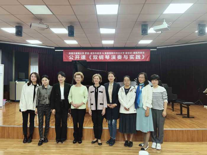 《双钢琴演奏与实践》公开课上,共有两组学生上台演奏。第一组学生演奏了格里埃尔的《六首钢琴小品》。对于学生的演奏,二位教授提出,在双钢琴的演奏过程中,需要注意旋律的流畅连贯,演奏旋律需要更加清晰明确,演奏时要相互听,注意声音的平衡性。第二组学生演奏了李斯特改编的《骷髅之舞》。教授首先对学生扎实的基本功提出表扬,同时也提出了改进意见:应当更多地注意原曲的音乐术语标记,充分表现作品风格特点,快速跑动段落要突出重点音。二位教授的讲解简明扼要,同时在授课过程中融入了个人学习与演奏的经历,与在场师生进行了互动讨论,学生们有效开拓了国际视野,积累了双钢琴作品演奏方面的知识与经验。