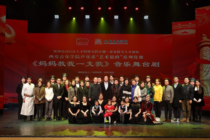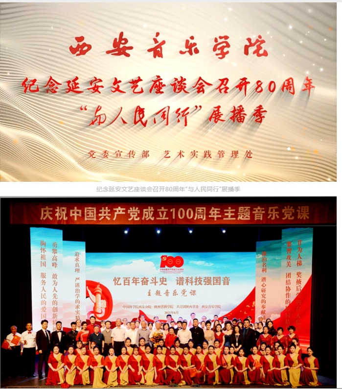 学校积极推动师生深度参与创作排演,让艺术实践真正成为思政育人的催化剂。先后组织举办了科学家院士专场、陕西高校专场、退役军人专场、陕西党史学习教育专场等一系列音乐党课,以及钢琴《琴音传薪火》——钢琴音乐中的党史、原创音乐剧《战火青春》、舞剧《红色家书》、艺术思政系列党课《妈妈教我一支歌》音乐舞台剧,让更多思想深邃、艺术精湛、制作精良的文艺精品走进社区、走进乡村、走进校园、走进军营。