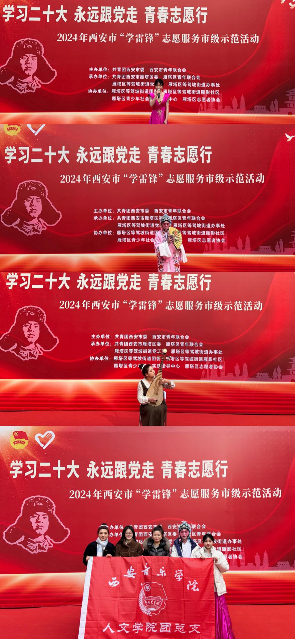 为弘扬雷锋精神,3月3日人文学院团总支应邀参加“学习二十大,永远跟党走,青春志愿行”学雷锋志愿服务活动,协同雁塔区禁毒办、团区委、公安雁塔分局在雁影社区开展“赓续雷锋精神 筑牢禁毒防线”禁毒宣传及“学雷锋”志愿演出。