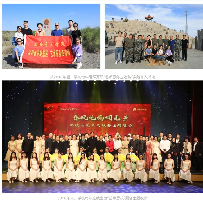 学校充分发挥艺术高校引领、辐射社会公共文化的“浸润”效应,经过8年因地制宜、因时制宜、因材施教的创新实践,取得了一系列教育教学新成果,拓展了音乐院校思政教育新形式。每年组织开展“艺术服务走边防”实践育人活动,师生们到达新疆北疆、云南老山、黑龙江漠河等边境一线慰问演出,应邀到全国30余家单位进行主题宣讲,相关事迹被学习强国、人民网、新华网等媒体宣传报道。近年来,“马小乐”学生社团积极发挥音乐启智润心功能,赴渭华起义革命纪念馆、西北政法大学、西安启智学校等地开展艺术思政实践教学和展演活动,在此过程中大学生增长才干、砥砺品质,体验了奉献爱心、服务社会的重要意义。