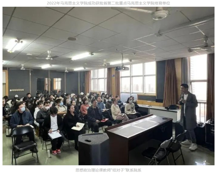学校成立了以校党委书记和校长为第一责任人的思想政治教育工作领导小组,定期调查研究、协调推进思政课建设相关工作。学校党委书记直接联系马克思主义学院,分管思想政治理论课建设工作。制定并落实《校领导“结对子”联系思想政治理论课教师制度》《思想政治理论课教师“结对子”联系院系制度》,构建起校领导-思政课教师-各院系“一对一”三级直达式联系工作格局,助推学校大思政格局构建。学校党委会每学期至少专题研究一次思想政治理论课建设工作,落实解决制约思政课建设和马克思主义学院发展的师资配备、办公用房、专项资金等瓶颈问题。2021年、2022年,学校连续两年给予马克思主义学院中央财政经费200万元的支持。2022年马克思主义学院成功获批省第二批重点马克思主义学院培育单位。