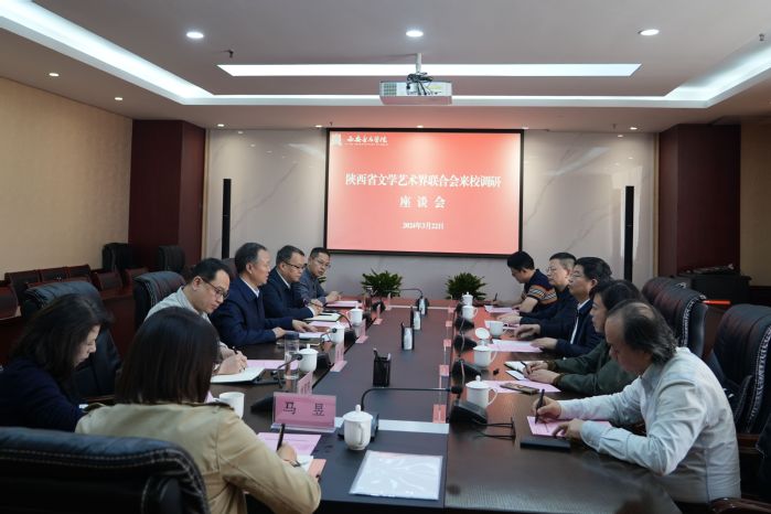 3月22日下午,陕西省文学艺术界联合会党组书记张琳一行5人来校调研交流。在机关第一会议室召开座谈会,我校党委书记张立杰、院长王刚、副院长侯颉出席,党政办、艺术实践处、舞蹈学院等部门负责人参加座谈交流。