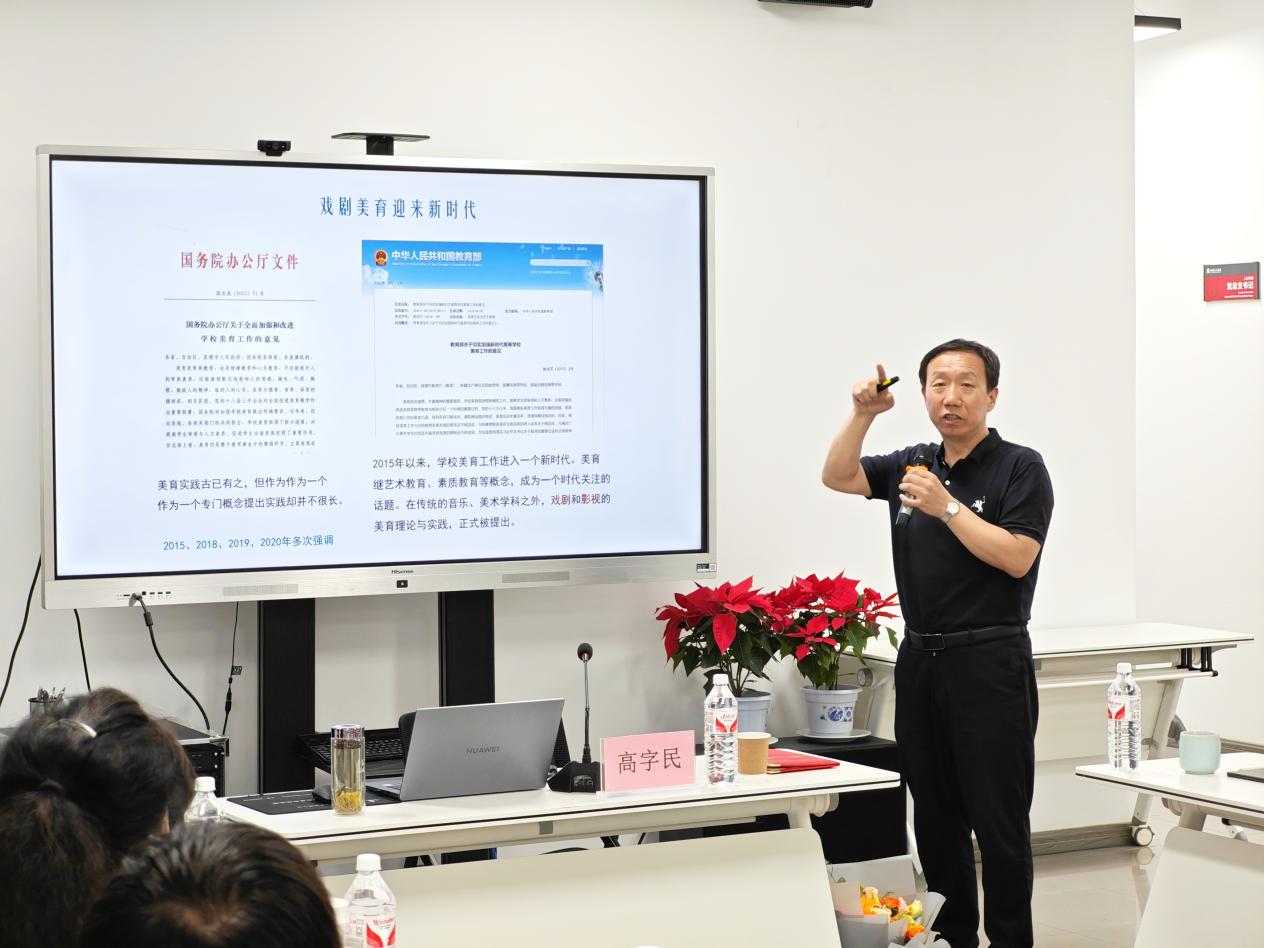 高字民老师通过展示西北大学戏剧影视文学系《红旗赋》课程思政与戏剧美育等资料,生动阐释了戏剧艺术如何以情感人、以美育人,传递出“以戏化人、以美育人、做而论道、培根铸魂”的美育理念。