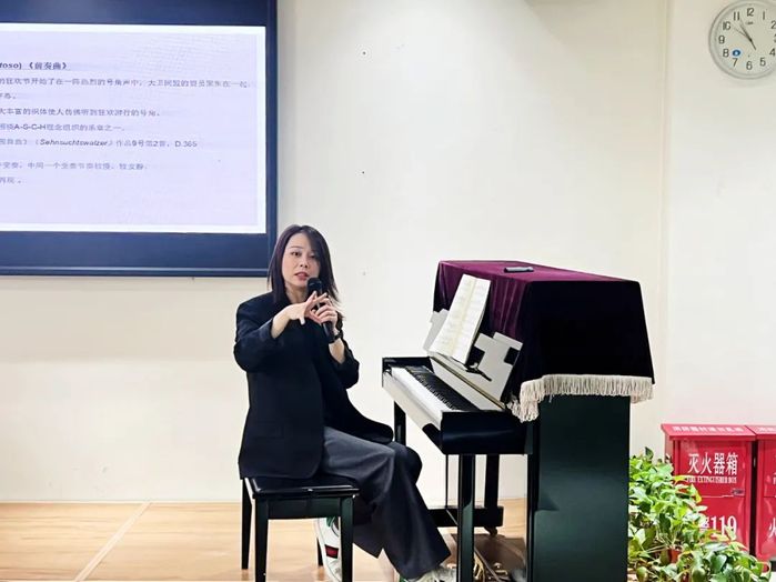 方瑞琪博士以“幻想与现实的碰撞”展开舒曼《狂欢节Op.9》的作品讲析。她从舒曼的历史背景及其创作历程出发,多角度的阐释了舒曼的音乐与精神世界,并对《狂欢节Op.9》这部经典钢琴作品的演奏技术与音乐思想进行了专业性的讲解。方博士不仅详细的介绍了作品各部分的具体内容并对其结构进行了细致分析,以精湛的演奏技艺诠释了舒曼的音乐作品特点与文学思想感情。讲座中表演实践与理论研究相统一,正如舒曼音乐中作曲技法和音乐理念的相辅相成,使音乐在“美”的听觉中更具思想的纵深性。