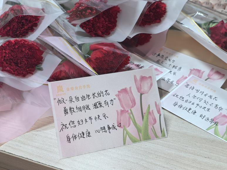 学生精心挑选象征师德的康乃馨,认真书写每张贺卡,“您是指引音乐之路的灯塔”“做一朵自由生长的花,勇敢细腻、温柔有力”等真挚话语,不仅承载着学生对老师的深深敬意与感恩,也如同温暖的阳光,照亮了老师们的心田。