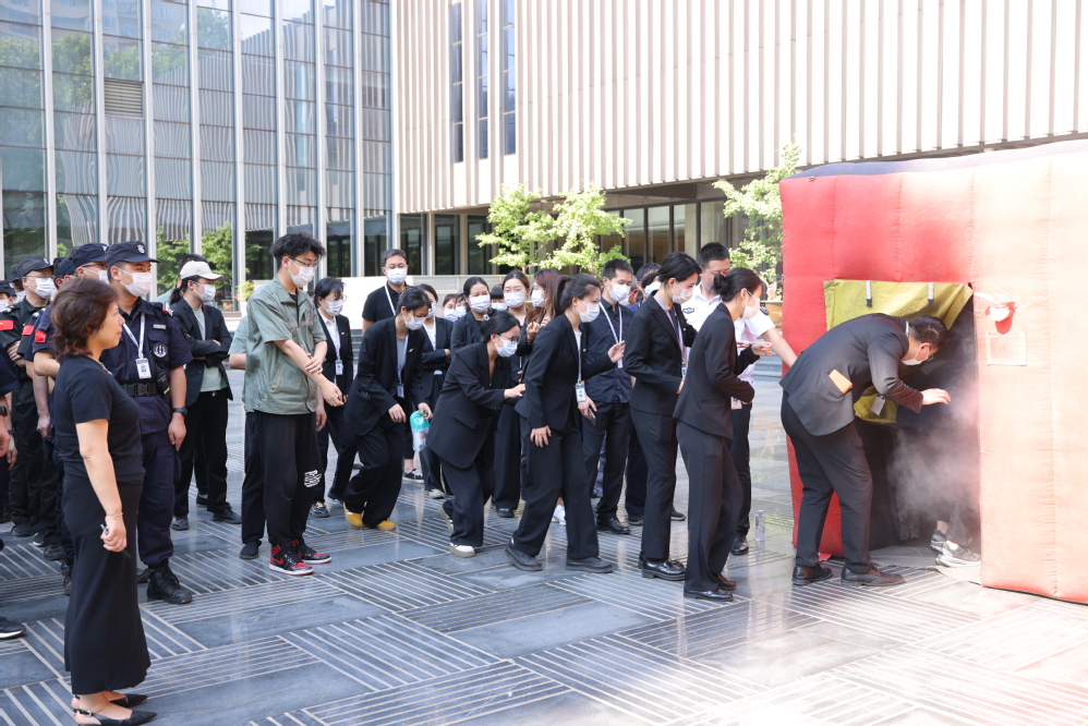 在理论培训结束后,全体员工来到西门广场,利用消防充气逃生舱模拟真实火灾中的浓烟及黑暗场景,以八人一组的形式分批进入舱内,亲身体验疏散逃生过程。体验结束后,大家纷纷表示,在浓烟和黑暗环境中极易迷失方向,遇到此类情况必须保持沉着冷静、团结协作。活动现场还开展了灭火器使用方法实操演练,员工们通过实际操作,学习并掌握了灭火器的正确使用方法,进一步熟悉了疏散路线,有效提高了应急反应能力。