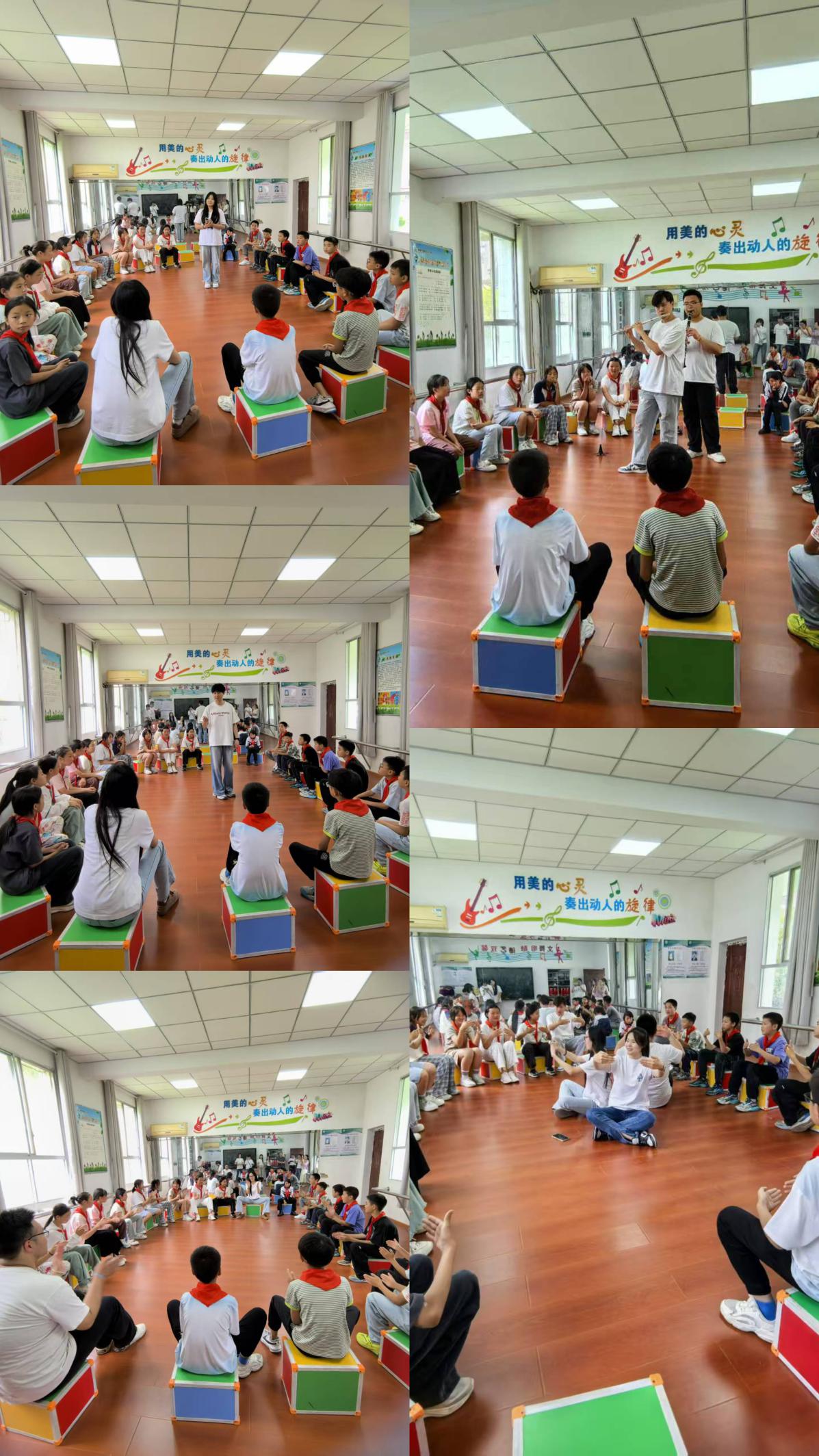 5月29日,实践团队走进杨家河镇中心小学,为20余名音乐社团学生定制系列特色音乐课。课程聚焦乐器启蒙、互动式新体系、心理美育与情感表达三大板块。队员们带来长笛、单簧管等乐器,让学生互动体验,感受其魅力。互动教学中,同学们借鉴奥尔夫、柯达伊等教学法,开展“节奏接龙”等趣味游戏,提升学生音乐感知力、节奏感与协作力。考虑到部分学生是留守儿童,课程融入情感疏导与自信培养环节。在愉悦氛围中,鼓励孩子用歌声、乐器敲击或肢体语言表达内心。