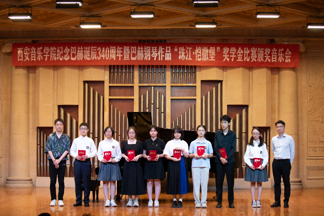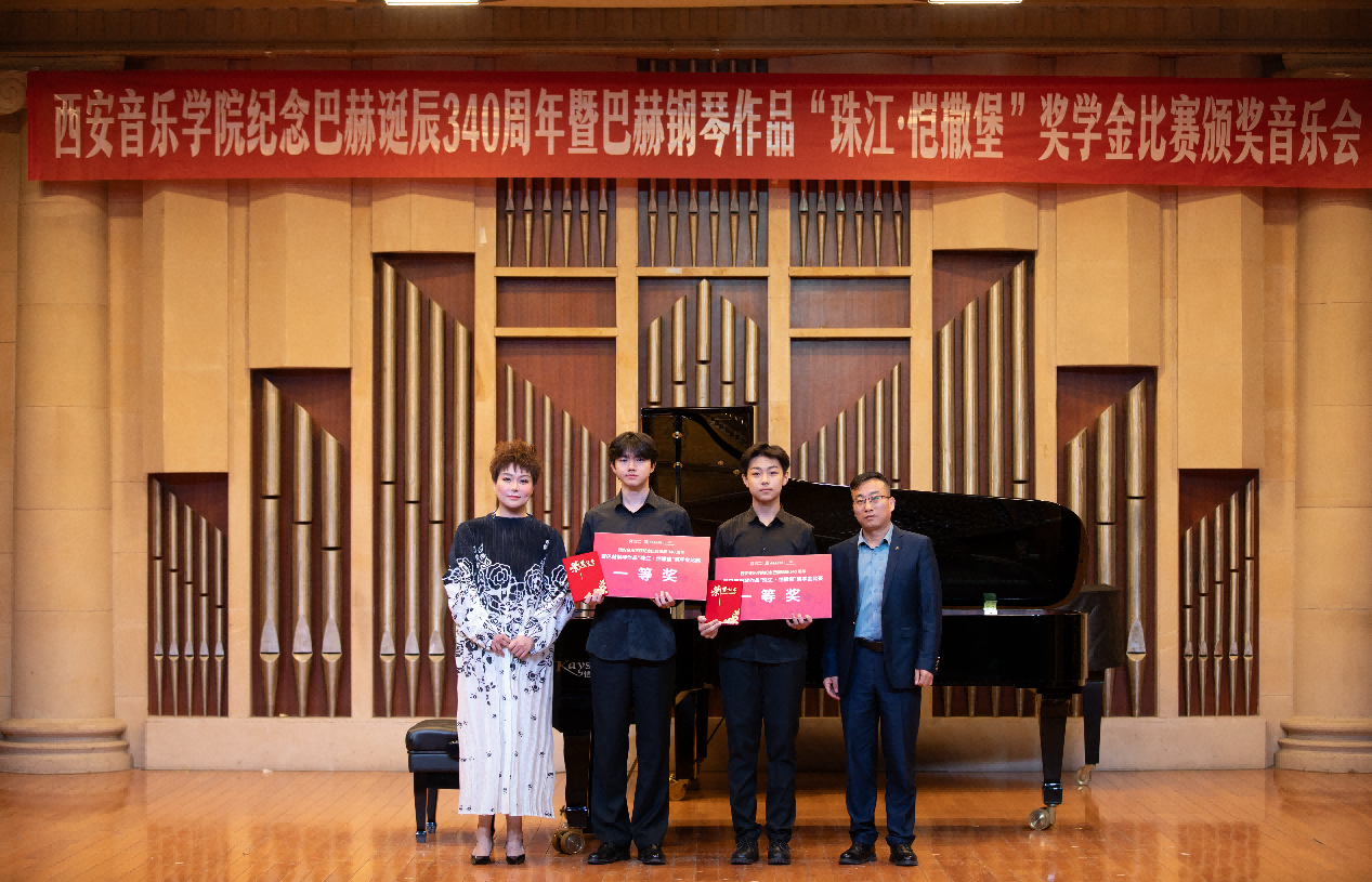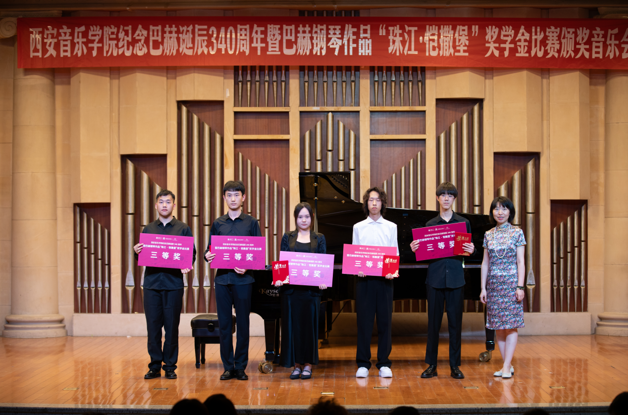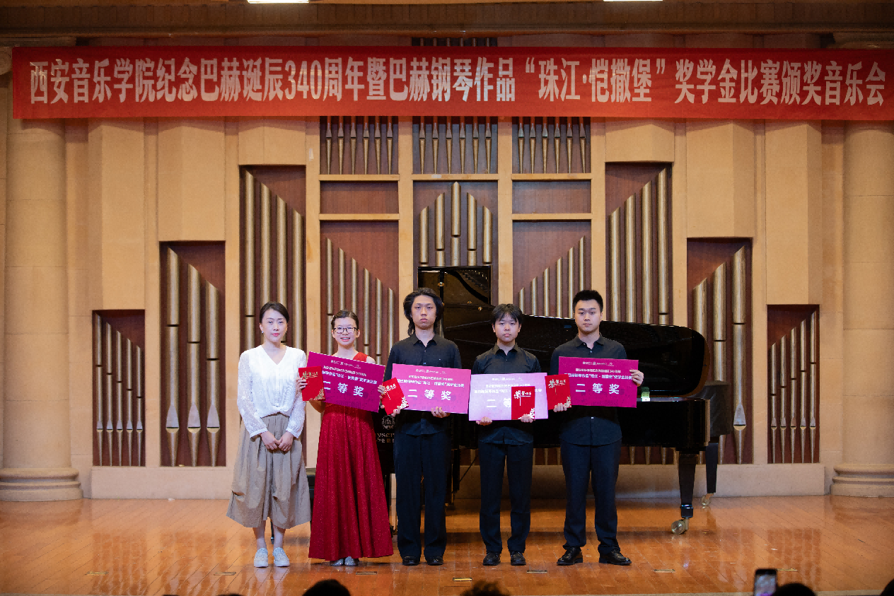 广州珠江·恺撒堡钢琴有限公司代表、钢琴系领导班子分别为获奖者颁奖。本次大赛一、二等奖获得者分别登台演奏。在观众热烈的掌声中,西安音乐学院"纪念巴赫诞辰340周年暨巴赫钢琴作品'珠江·恺撒堡'奖学金比赛"圆满落幕。