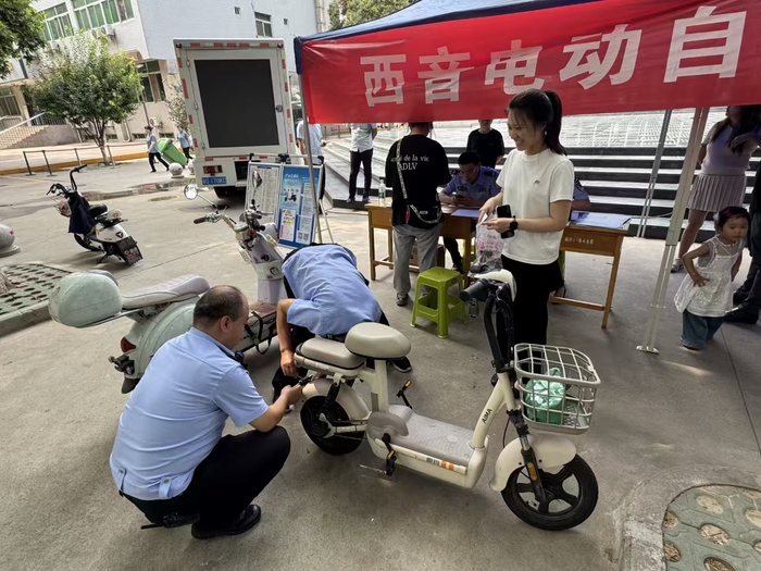 为推进平安校园建设,结合“安全生产月”及《西安市电动自行车管理规定(试行)》要求,6月18日,学校保卫处联合西安市公安局交通管理支队法宣大队、雁塔大队小寨中队,在艺术中心前广场开展电动车挂牌及交通普法宣讲活动。