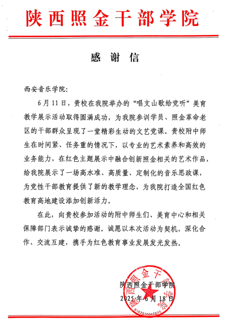 本次活动的成功举办,不仅展现了西音附中服务社会美育的使命与担当,为学校美育事业发展、创新思政育人模式注入了新动能。基于与照金干部学院良好的联建效果,干部学院特发来感谢信,表达了对西音附中支持学院音乐党课建设的诚挚谢意。未来,我校将以赤诚之心,与地方院校、相关社会机构携手同行,继续探索艺术美育与思政教育融合的长效机制,让红色基因在艺术的传承中生生不息。