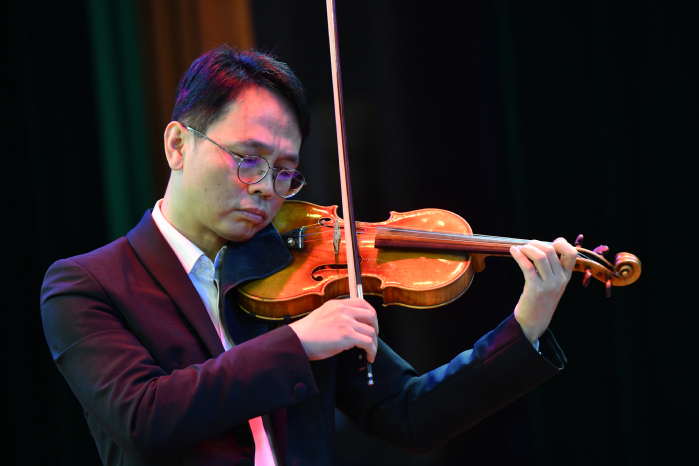 小提琴演奏家田晖、二胡演奏家马赛赛、男高音歌唱家邢立珂、女高音歌唱家焦洋、青年钢琴家吴羽翀等师生代表,携手舞蹈学院、民族器乐系九舞弓弦乐团、音乐教育学院春之声合唱团及现代音乐学院《战火青春》创演团队,共同演绎了14部红色经典与时代新作,生动诠释了军民团结、鱼水情深的时代主题。