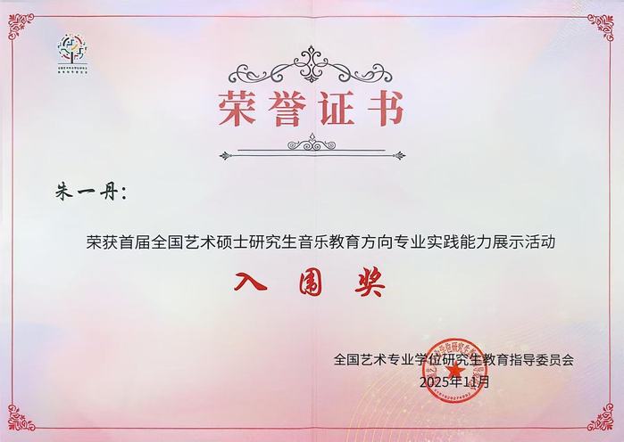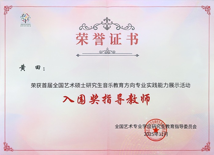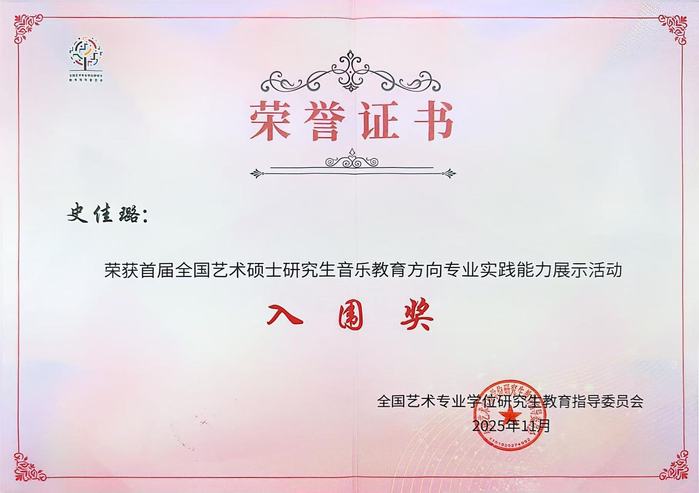 近日,由全国艺术专业学位研究生教育指导委员会主办的首届全国艺术硕士研究生音乐教育专业实践能力展示活动在东北师范大学圆满落幕。我校两位研究生史佳璐(指导教师:赵垒)、朱一丹(指导教师:黄田)凭借扎实的专业素养和稳定的现场发挥,双双荣获“入围奖”,赵垒、黄田两位老师获“入围奖指导教师”称号,我校也以出色的组织工作获评“优秀组织单位奖”。