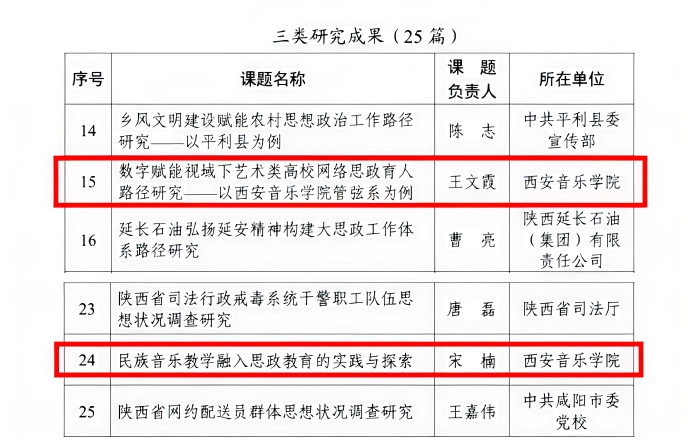 近日,陕西省委宣传部、思想政治工作研究会发布2025年度思想政治工作研究成果入选名单。我校管弦系王文霞副教授申报的《数字赋能视域下艺术类高校网络思政育人路径研究——以西安音乐学院管弦系为例》、民乐系宋楠副教授申报的《民族音乐教学融入思政教育的实践与探索》两项成果,均荣获陕西省政研会系统2025年思想政治工作研究成果三等奖。