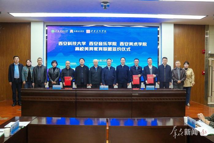 会上,联盟高校共同签署了《高校美育教育联盟框架合作协议》,三所学校将以此次联盟为起点,不断深化美育教学改革、创新美育实践载体、打造美育特色品牌,打破“专业”与“通识”的壁垒,熔铸“科技”与“艺术”的精魂,培养更多德智体美劳全面发展的时代新人,共同谱写陕西高校美育教育高质量发展的新篇章。