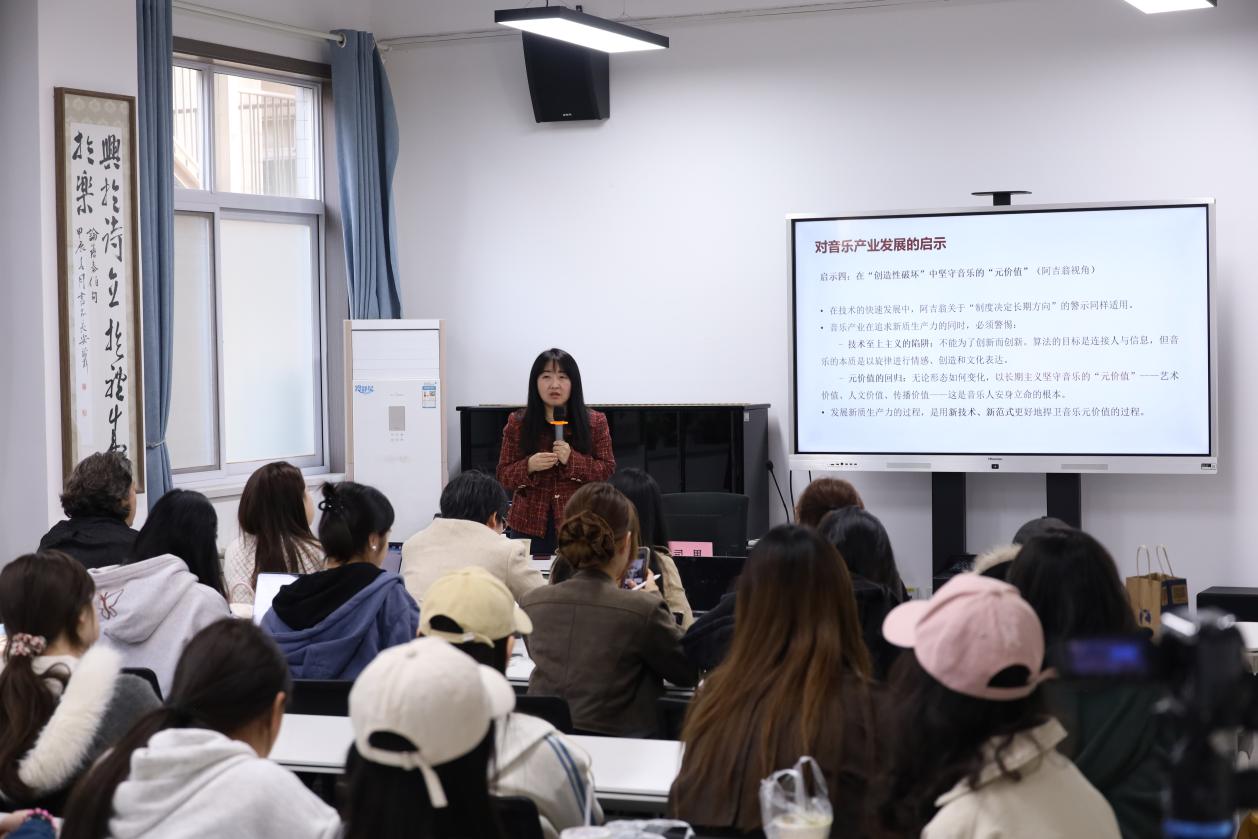 司思教授以新质生产力为核心理论视角,紧扣技术革新与平台迭代驱动下数字音乐产业的全新变革,从产业结构升级、平台格局演变、运营模式创新等维度,对行业发展现状进行了全面且系统的剖析。她以详实数据、开阔视野深入解读了数字音乐产业的未来发展趋势、产业环境迭代历程以及业态演进内在逻辑,结合国内外行业经典案例,重点分析了数字技术革新、平台机制优化以及AIGC技术应用对音乐产业生态的重塑作用。同时,围绕数字音乐版权保护、产业多元盈利模式构建、“音乐+”跨界融合发展等行业热点与实践难题,展开深度探讨,为在场师生把握产业前沿动态、理解行业发展规律,搭建了系统的理论框架,提供了鲜活的现实参考。