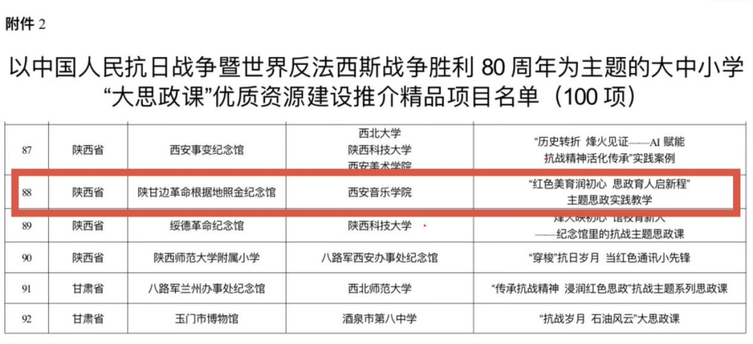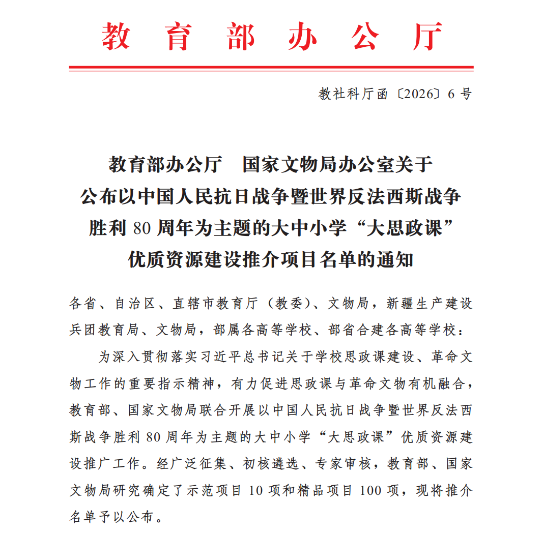 近日,教育部办公厅、国家文物局办公室联合公布了以中国人民抗日战争暨世界反法西斯战争胜利80周年为主题的“大思政课”优质资源建设推介项目名单。在全国遴选出的100项精品项目中,我校与陕甘边革命根据地照金纪念馆合作的“红色美育润初心 思政育人启新程”主题思政实践教学项目成功入选。