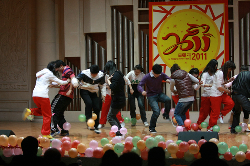 轻松快乐的击鼓传花游戏给会场增添了无限的欢乐气氛,院党委书记安宁为大家送上了节日的祝福,金伟教授一段精彩的绕口令让全场师生叫好一片。
