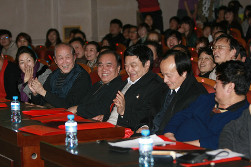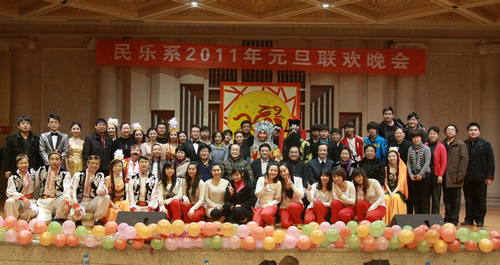 “火树银花触目红,揭天锣鼓闹春天”。2010年12月31日晚上7点30分,我院学术厅华灯璀璨、欢歌飞扬,大红色的横幅、彩色的气球、兔年窗花的背景、绚丽的彩带将学术厅装扮的喜气洋洋,热闹的会场座无虚席、笑声连连、掌声阵阵,民乐系的师生和大家欢聚一堂载歌载舞,共同迎接美好的2011年。院党委书记安宁,党委副书记、常务副院长孙卫国,纪委书记王平,副院长白陆平、安金玉,院长助理王真一起观看晚会;原副院长鲁日融和民乐系的老教师们也观看了晚会。干部人事处长文戈、宣传部长史小眉、学工部长强陆平担任了晚会的评委。