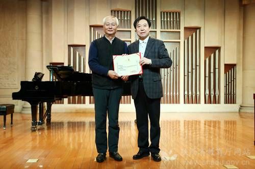 中国音协主席、西安音乐学院院长赵季平(左)向沈阳音乐学院院长刘辉颁发聘书