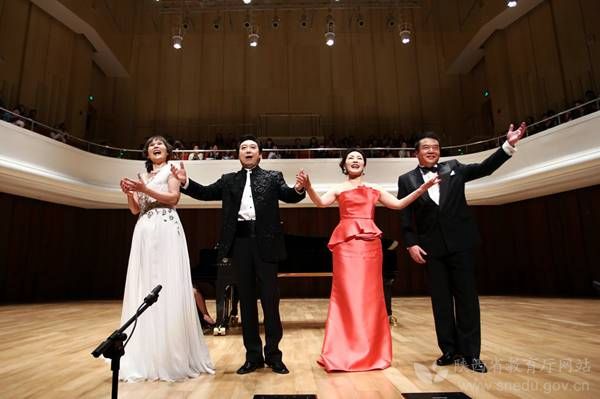 西安音乐学院与上海音乐学院、沈阳音乐学院三院校教学实践与演唱音乐会上四位歌唱家(左起:张宁佳、刘辉、方琼、白萌)表演现场