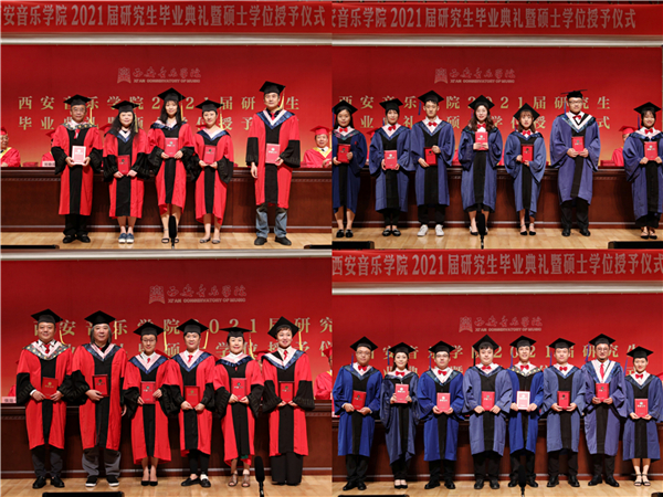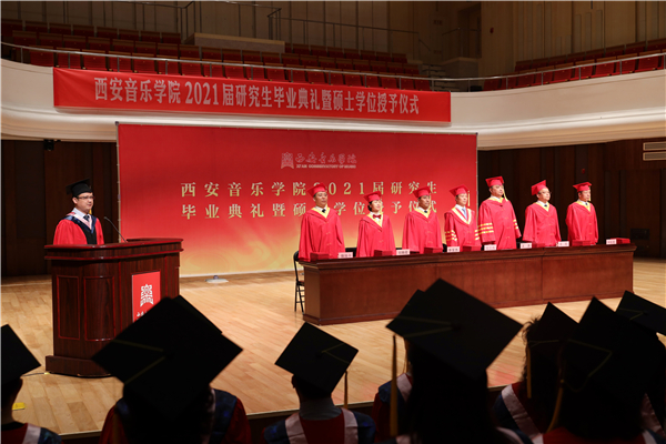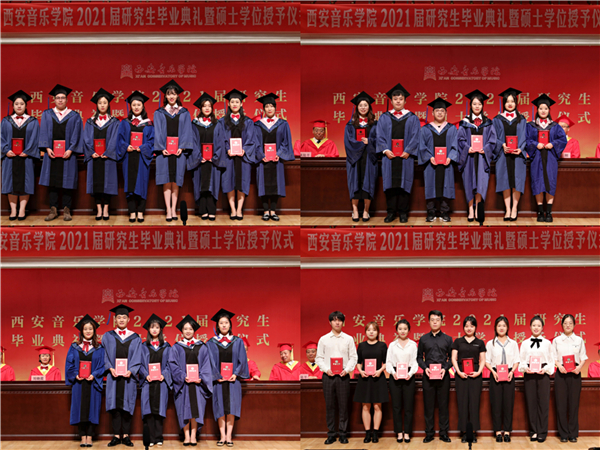 典礼在庄严的《中华人民共和国国歌》声中拉开帷幕。党委副书记李宝杰宣读学校《关于准予2021届赵雪等214名研究生毕业的决定》《关于授予2021届赵雪等214名研究生硕士学位的决定》《陕西省教育厅办公室关于表彰2021届陕西省高校优秀毕业生和优秀学生干部的通报》。党委副书记王刚宣读学校《关于表彰2021届硕士研究生优秀学位论文、优秀毕业音乐会的决定》《关于表彰2021届优秀硕士研究生毕业生、2021年度优秀研究生学生干部的决定》。与会校领导为8名优秀论文获得者、8名优秀毕业音乐会获得者以及指导教师、2名陕西省高校优秀毕业生、20名西安音乐学院硕士研究生优秀毕业生以及13名优秀研究生学生干部颁发了荣誉证书。