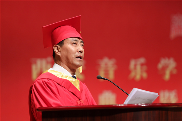 校党委书记张立杰代表学校向全体2021届硕士研究生表示热烈祝贺,并向辛勤工作的导师和背后默默付出的毕业生亲友致以崇高的敬意和真挚的感谢。张立杰在讲话中对全体毕业生寄予三点希望:一是做一个有责任感的人,积极承担起文艺工作者记录新时代、书写新时代、讴歌新时代的使命,始终把奉献社会、服务人民,不负韶华、追求卓越作为自己一生不可放弃的职责;二是做一个勇于创新的人,面对当前“百年未有之大变局”,希望同学们在以后的文艺创作中勇于批判,大胆探索,自主创新,努力推陈出新,创作出更多新的优秀的文艺作品;三是做一个不忘初心的人,三年的学习经历来之不易,三年学习生涯也充满艰辛与挑战,希望大家毕业走向社会做出人生选择前,牢记激励自己三年不断奋进的初心,坚定理想信念,在壮阔的人生道路上笃定前行。