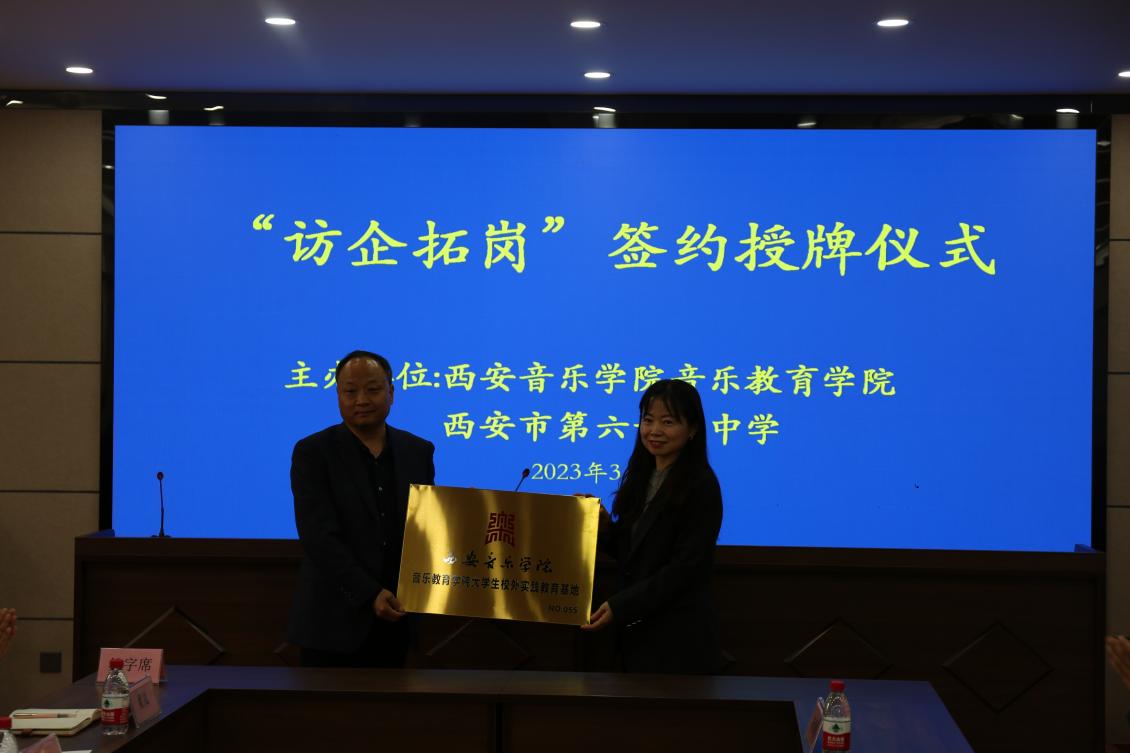 3月30日,音乐教育学院为扎实推进学校 “访企拓岗”促就业工作,院分党委书记王倩、正处级组织员赵军伟、分党委副书记张志强、副院长袁建军等一行人到位于莲湖区红庙坡街道的西安市第六十七中学实地走访,并与六十七中学举行了“音乐教育学院大学生校外实践基地”签约仪式。