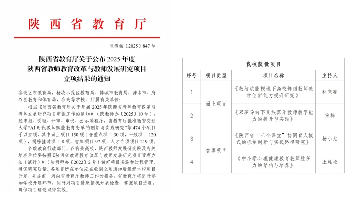 近日,陕西省教育厅印发《关于公布2025年度陕西省教师教育改革与教师发展研究项目立项结果的通知》,我校成功获批项目4项,其中林亮亮老师主持的《数智赋能视域下高校舞蹈教师教学创新能力提升研究》项目和宋楠老师主持的《双驱导向下民族器乐教师教学能力的提升与实践》项目获批面上项目,杨小龙老师主持的《陕西省“三个课堂”协同育人模式的机制创新与实践路径研究》项目和王延松老师主持的《中小学心理健康教育教师胜任力的结构与培养》项目获批智库项目。