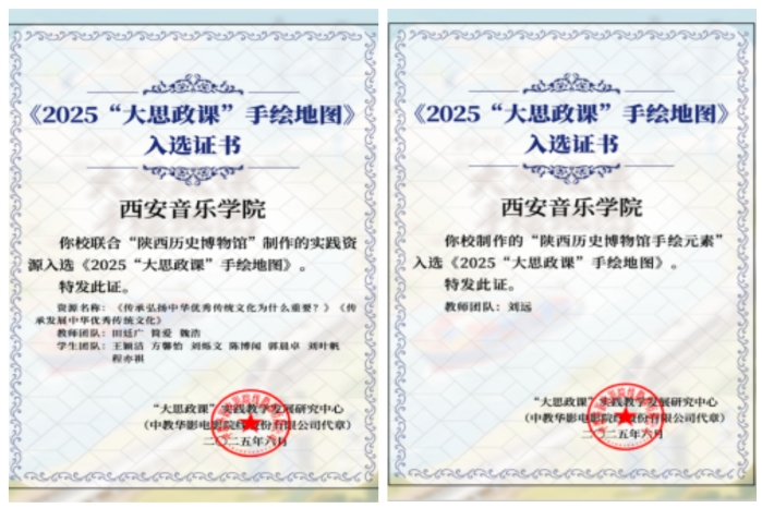 为深入贯彻《教育强国建设规划纲要(2024—2035年)》,落实教育部“打造一批‘大思政课’品牌”的重点任务,丰富高校思政课实践教学内容,并依托“行走的思政课”“大学生讲思政课”讲好新时代故事。我校对此次申报工作高度重视,通过与陕西历史博物馆开展深度合作,组织师生团队深度调研、集中研讨与精心打磨。最终,我校创作高校思政课实践教学资源《为传承弘扬中华优秀音乐文化贡献青春力量》并推出三项成果,成功入选教育部《2025“大思政课”手绘地图》项目。其一为马克思主义学院教师田廷广主讲的“博物馆里的思政课”实践教学资源作品《传承弘扬中华优秀传统文化为什么重要?》;其二为由刘远老师创作的“为传承弘扬中华优秀音乐文化贡献青春力量手绘元素”作品一副;其三为学生王颖洁、方馨怡、刘烁文、陈博闻、郭晨卓、刘叶帆、程亦祺主讲的同类型作品《传承发展中华优秀传统文化》。