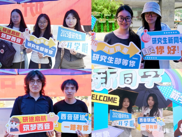 迎新现场特别设置了拍照留影区。细雨中,伞下的笑容在相机镜头里格外鲜明,手中的标语映衬出独特的仪式感。一张张照片见证了他们以研究生身份走进西音校园,承载着对学术起点的铭记和对未来的美好憧憬。