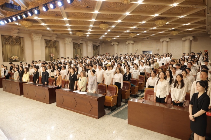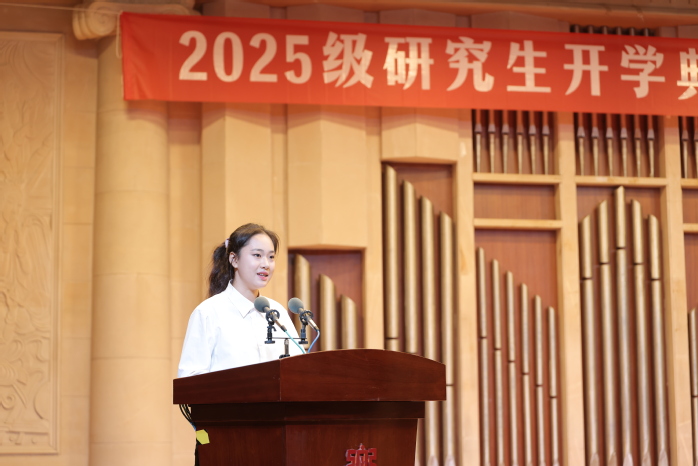 2025级新生代表胡嘉芮在发言中表示,研究生阶段是学术探索与身份转变的新起点,需要既有沉潜的定力,也要有创新的锐气。她号召同学们牢记校训“明德教化,乐音至善”,以青春和奋斗勇立潮头,努力成长为有理想、有本领、有担当的新时代青年。