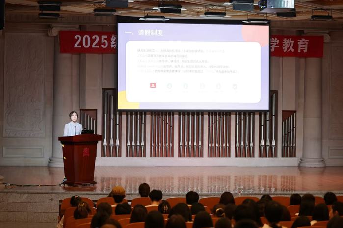 典礼之后,研究生部为新生开展了入学教育,为未来的学习和研究指明方向。研究生部路敏老师向新生系统讲解了研究生学籍管理及培养全过程的相关规定,并对研究生教育综合管理系统的使用进行了详细指导。研究生部刘晶漪老师围绕研究生培养计划和课程设置进行了说明,重点强调了学分要求和成绩考核标准。2025级新生辅导员马琼烨老师则召开了入学思想教育主题班会,向新生介绍了各项规章制度,开展了日常安全教育,就党团关系转接及入团入党事宜作了说明,并帮助学生建立职业规划意识。