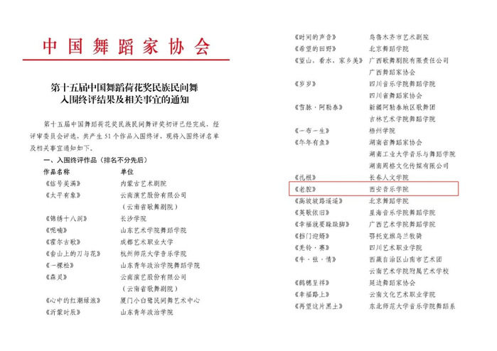 日前,第十五届中国舞蹈“荷花奖”民族民间舞评奖活动初评工作圆满结束。经激烈角逐与严格评审,西安音乐学院舞蹈学院精心创排的舞蹈作品《老腔》从全国众多优秀参赛作品中脱颖而出,成功入围终评。这是继我校原创舞蹈作品《俑生俑事》荣获第十四届中国舞蹈“荷花奖”古典舞奖后,再次在这一国家级舞蹈最高奖项评选中取得重要突破。