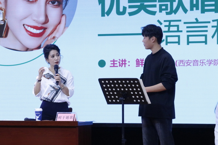 交流活动期间,声乐系鲜于越歌教授受邀在陕西理工大学音乐厅举办“优美歌唱的前提——语言与技巧”专题讲座。