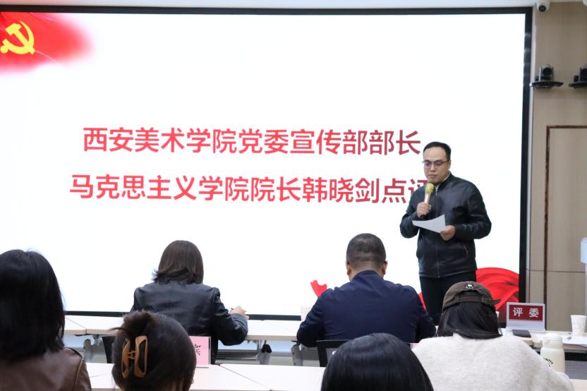 展示结束后,西安美术学院党委宣传部部长、马克思主义学院院长韩晓剑教授代表评委对活动进行了专业细致点评,他认为,选手们的表现情感真挚、内容扎实、思政导向鲜明、艺术特色突出,成功实现了思政教育与专业能力的深度融合,展现了我校学子扎实的理论素养、深厚的艺术功底与蓬勃的创新活力,为“艺术思政”教学模式提供了生动注脚。
