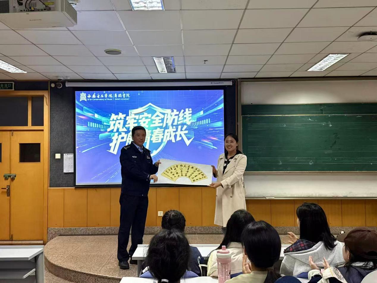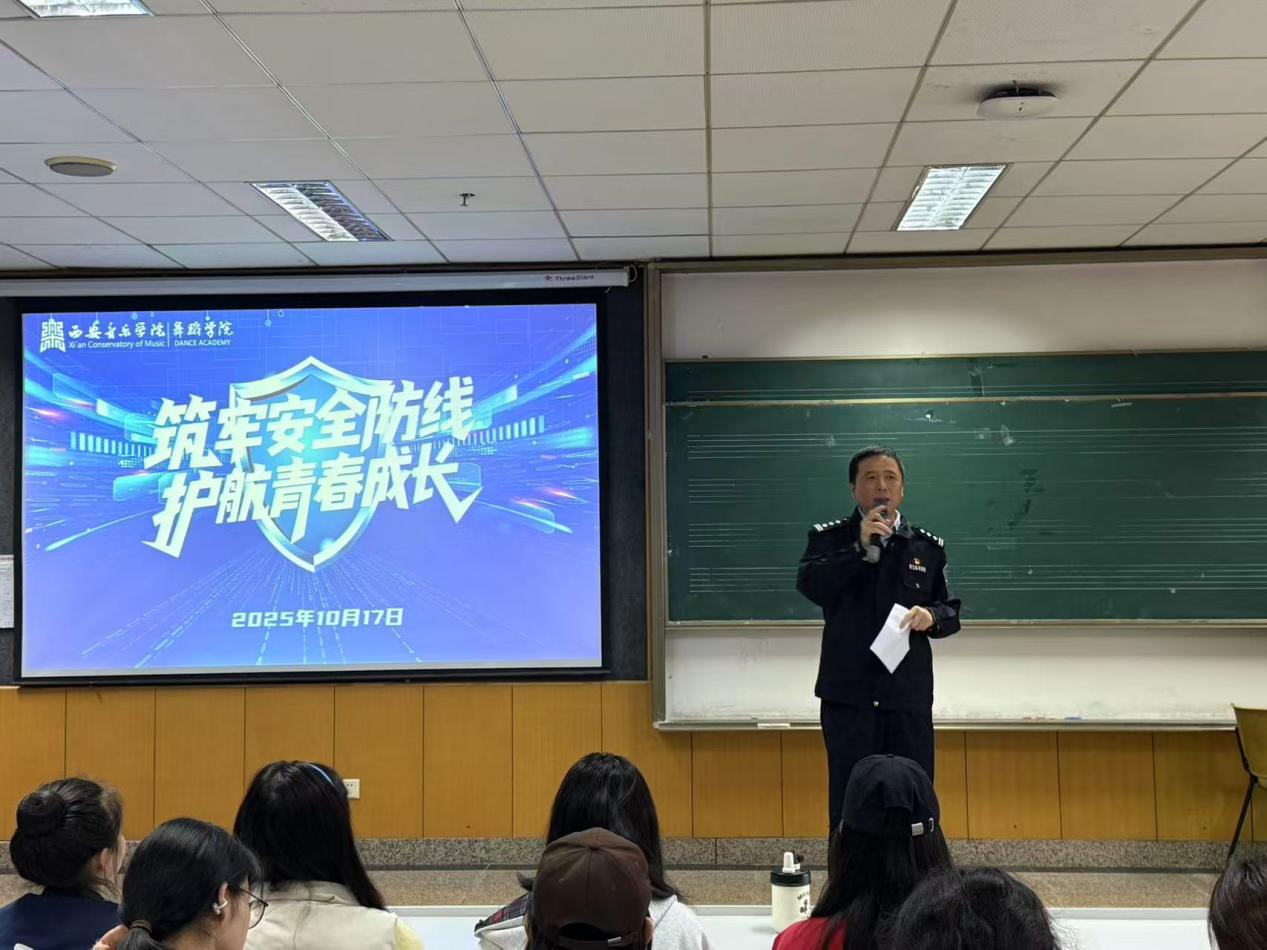 为增强同学们的安全意识,提升自我保护能力,共同营造安全、和谐、稳定的校园环境,10月17日,舞蹈学院特邀雁塔分局小寨路派出所音乐学院警务室徐勇军警官开展“筑牢安全防线,护航青春成长”安全教育专题讲座。校保卫处、舞蹈学院学工队伍及2025级全体学生参加了活动。
