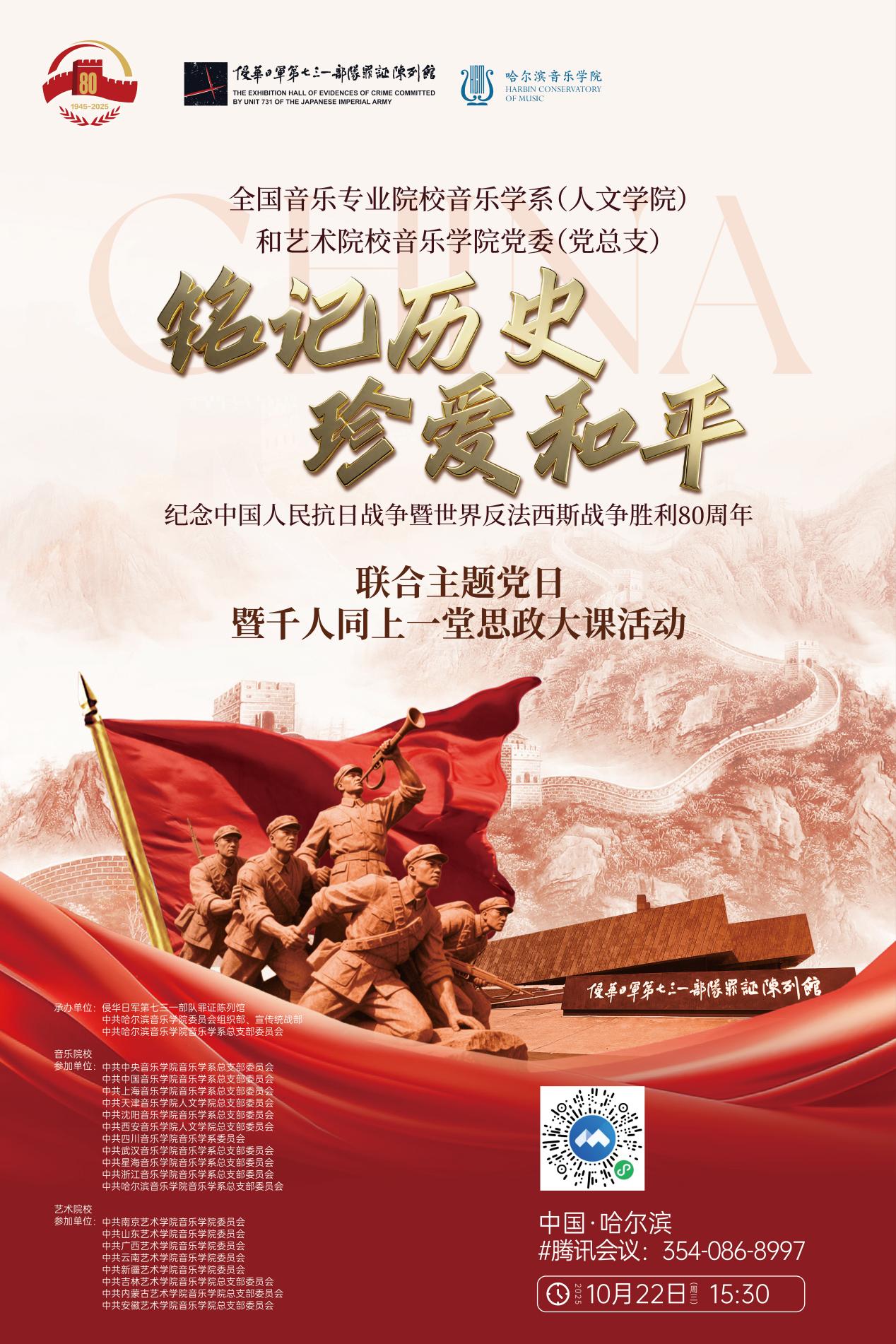 为纪念中国人民抗日战争暨世界反法西斯战争胜利80周年,厚植爱国主义情怀,10月22日,西安音乐学院人文学院党总支应邀参加由哈尔滨音乐学院音乐学系党总支发起的“铭记历史 珍爱和平”联合主题党日活动,同时参与本次活动的还有来自全国音乐专业院校音乐学系(人文学院)和艺术院校音乐学院党委(党总支)的广大师生。人文学院党员师生代表参加本次活动。