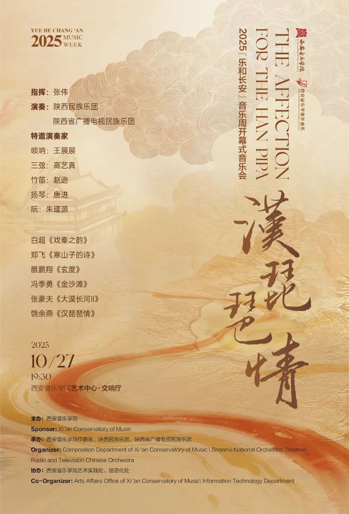 10月27日晚,由西安音乐学院主办,西安音乐学院作曲系、陕西民族乐团、陕西省广播电视乐团承办的“2025乐和长安音乐周开幕式音乐会——《汉琵琶情》”在西安音乐学院艺术中心交响厅隆重举行。院长王刚,副院长候颉、郭强出席开幕式音乐会。