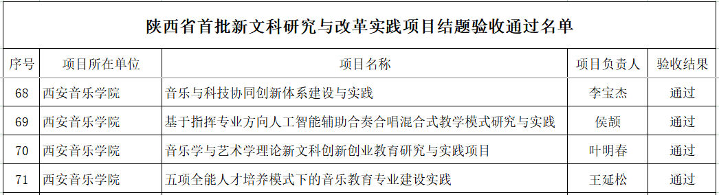 新文科建设是推动学科交叉融合、优化人才培养模式的重要举措。此次我校通过验收的项目涵盖音乐与科技、人工智能辅助教学、新文科创新创业教育、音乐教育实践等领域,展现了我校在音乐类文科教育改革中的实践探索。
