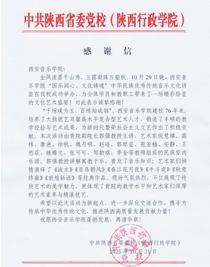 中共陕西省委党校(陕西行政学院)向我校发信感谢,信中高度评价此次活动,指出西安音乐学院建校76年来,始终坚守育人初心,培养了大批德艺双馨的高水平艺术人才,为国家文化教育事业作出重要贡献。此次民乐鉴赏活动,是省委党校深化“两个结合”重要理念的生动实践,通过民族音乐这一文化载体,助力师生增强文化自信、筑牢信仰根基,为推进中华优秀传统文化融入干部教育培训提供了宝贵范例。