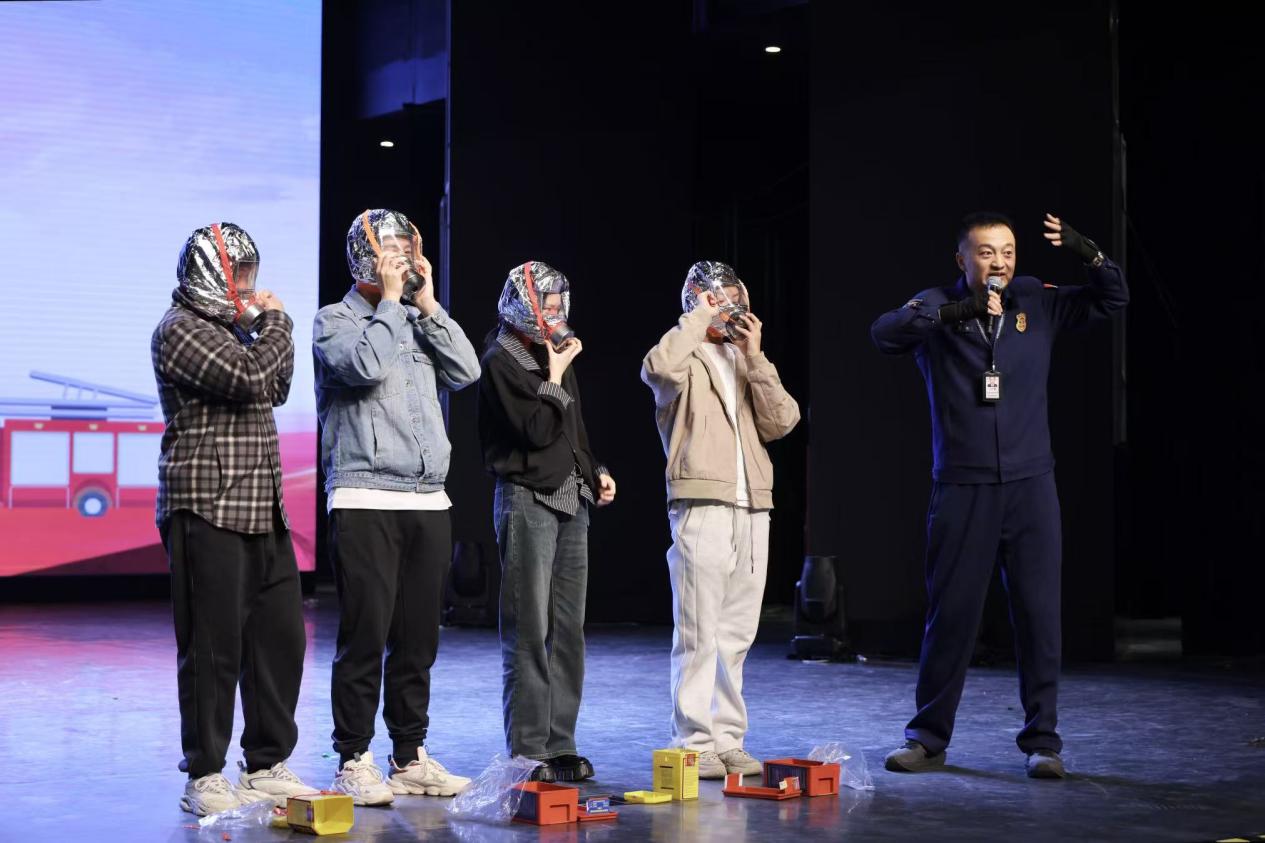 讲座由曲江新区消防救援大队王征担任主讲。他结合自身丰富的消防救援经历展开讲解,并重点分析了常见火灾情境下的正确应对措施,就“发生火灾时该如何行动、是否应该立即逃跑”等关键问题提供了科学指导。在灭火器使用教学环节,王征通过两个新颖有趣的短片,现场演示了“提拔握压”四字操作口诀。通过真实案例解析,生动说明了消防设施的正确使用方法,其中特别演示了消防水带“一甩两接拧到底”的连接技巧。同时,还设置了实操体验环节,并邀请现场同学上台练习使用防火面具、灭火器及消防栓等消防器材。